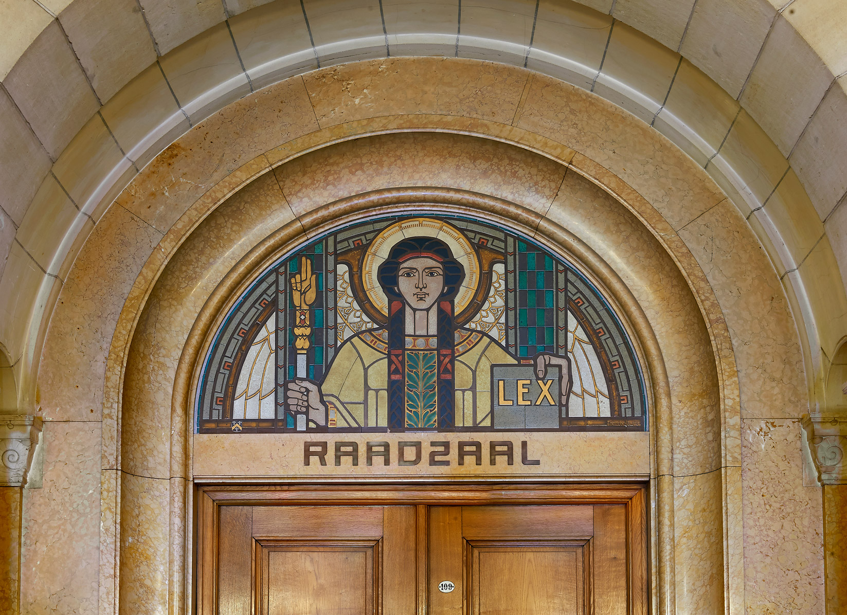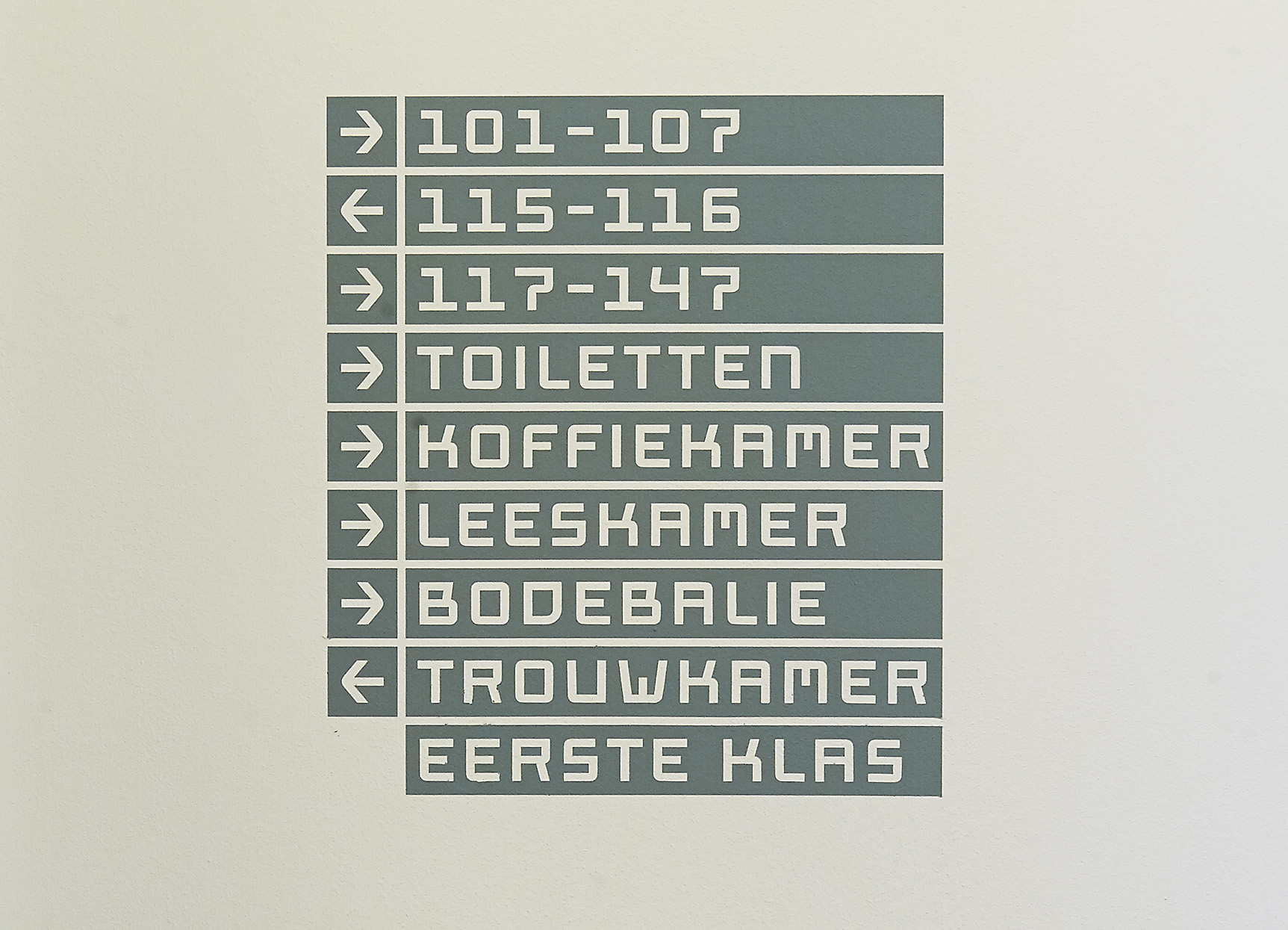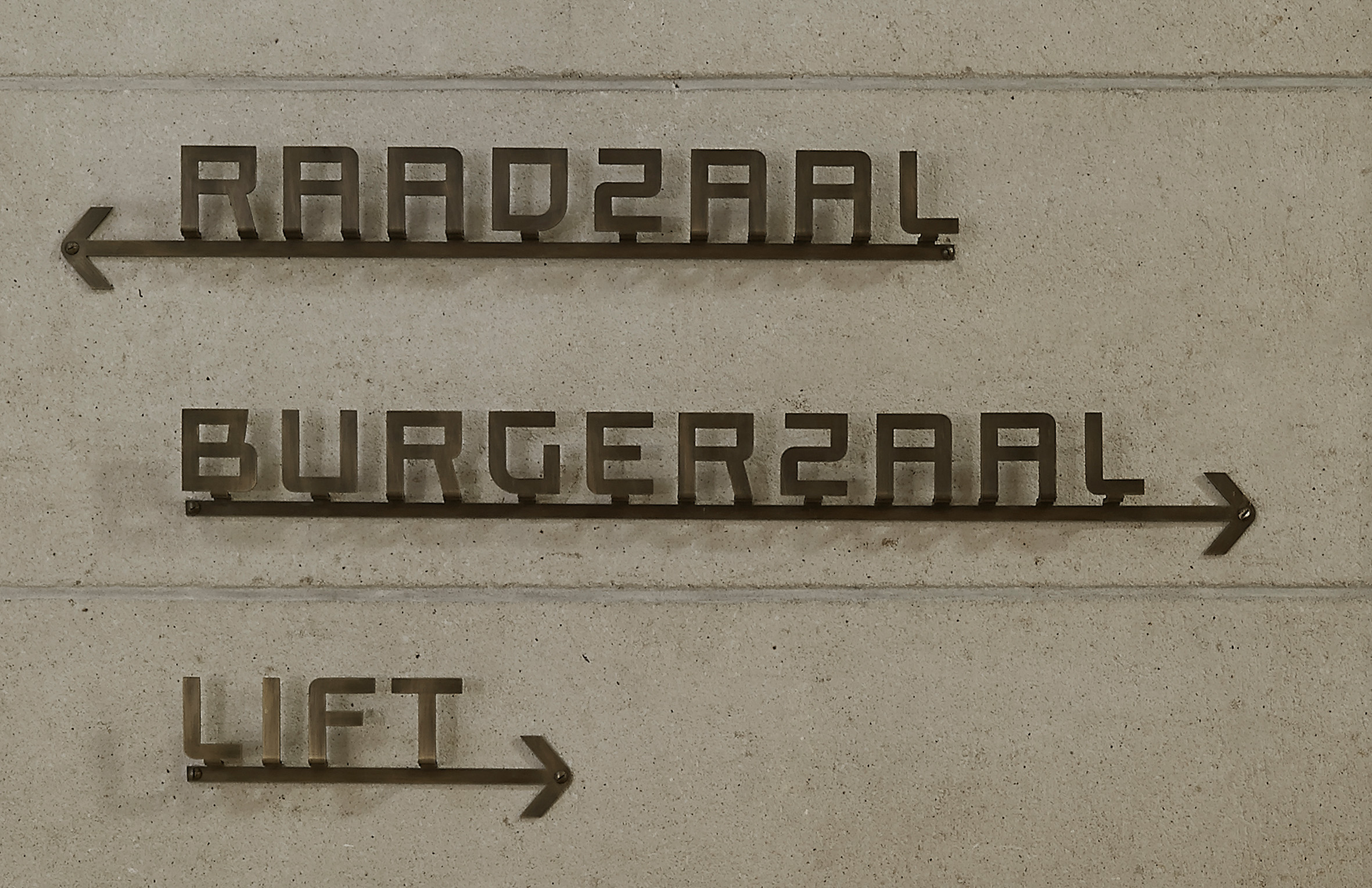 Met deze letter is vervolgens een compleet bewegwijzeringsplan opgesteld voor het gehele stadhuis. De kleuren van de signing zijn heel precies afgesteld op de kleuren van de lambriseringen, de functies en de materialen zoals toegepast in het Stadhuis.